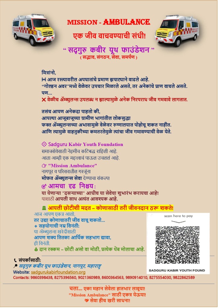 Sadguru Kabir Youth Foundation एक समर्पित संगठन है, जिसका उद्देश्य युवाओं को सद्गुरु कबीर के उच्च आदर्शों और शिक्षाओं से प्रेरित करना है। सद्गुरु कबीर का जीवन और उनके द्वारा दी गई शिक्षा न केवल आध्यात्मिक जागरूकता के प्रतीक हैं, बल्कि मानवता, प्रेम, सत्य, और सामाजिक सुधार के मार्गदर्शक भी हैं।सद्गुरु कबीर की शिक्षाओं से प्रेरित होकर, हमारा संगठन युवाओं को जागरूक करता है कि वे अपने समय और क्षमता का सदुपयोग समाज सेवा, शिक्षा, स्वास्थ्य जागरूकता और पर्यावरण संरक्षण जैसे रचनात्मक कार्यों में करें। इस दिशा में हम विभिन्न कार्यशालाओं, सेमिनारों, शिविरों और अन्य सामाजिक गतिविधियों का आयोजन करते हैं, जिससे युवाओं को सही मार्गदर्शन और प्रेरणा मिल सके।